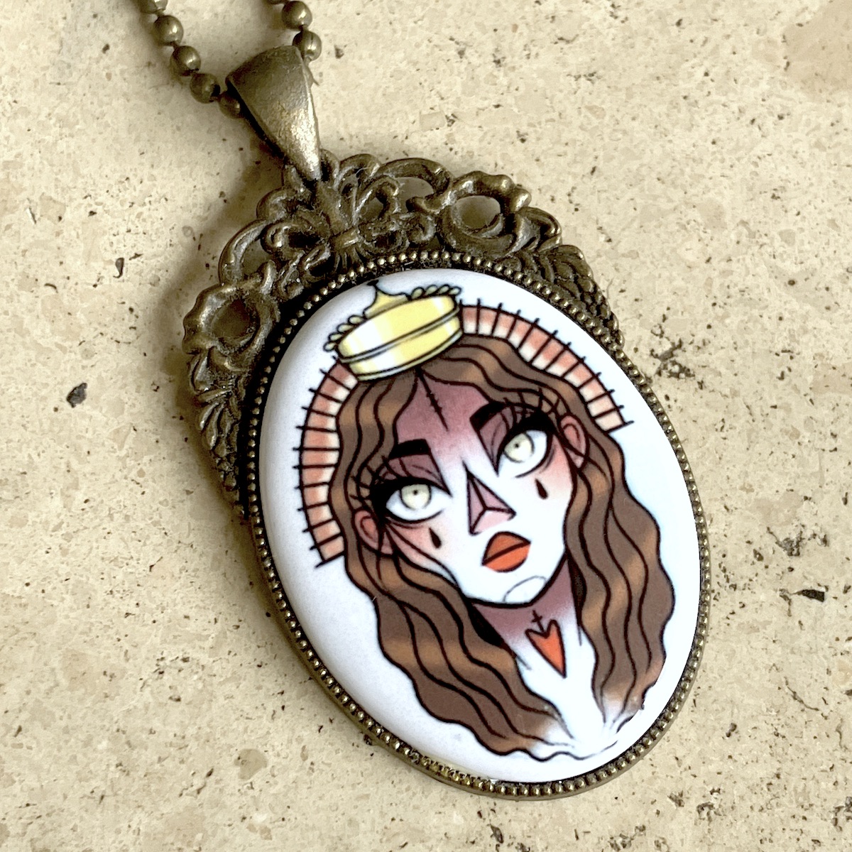 Pendentif en métal monté d’un camée en céramique (4cm*3cm) imprimée artisanalement par mes soins.