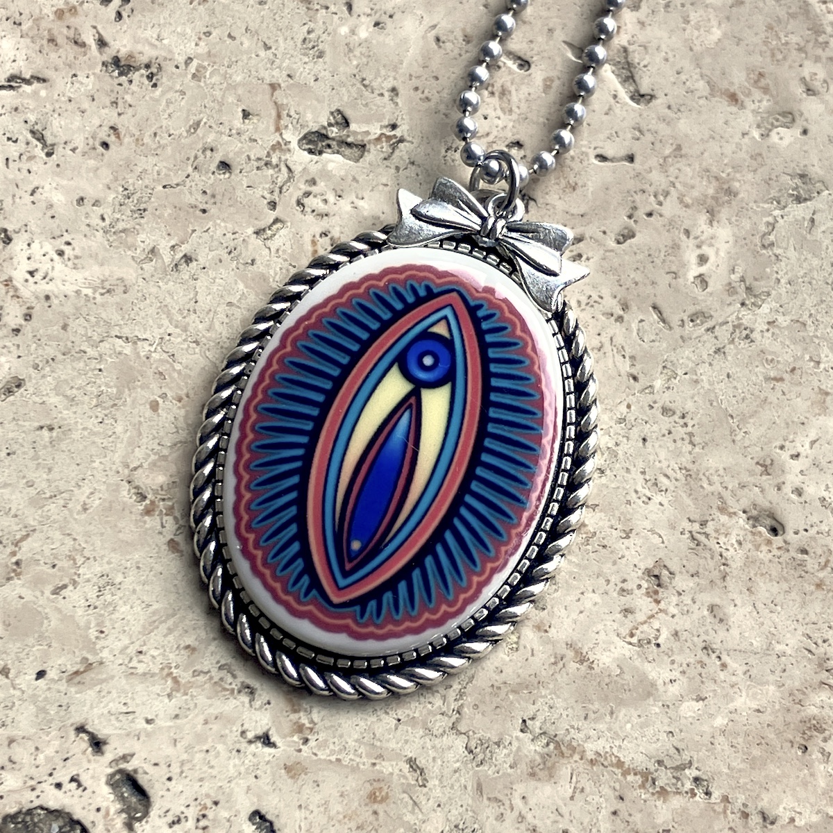 Pendentif en métal monté d’un camée en porcelaine (4cm*3cm) imprimée artisanalement par mes soins.
