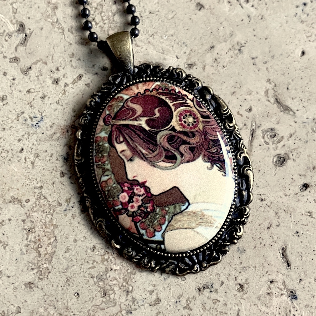 Pendentif en métal monté d’un camée en céramique (4cm*3cm) imprimée artisanalement par mes soins.